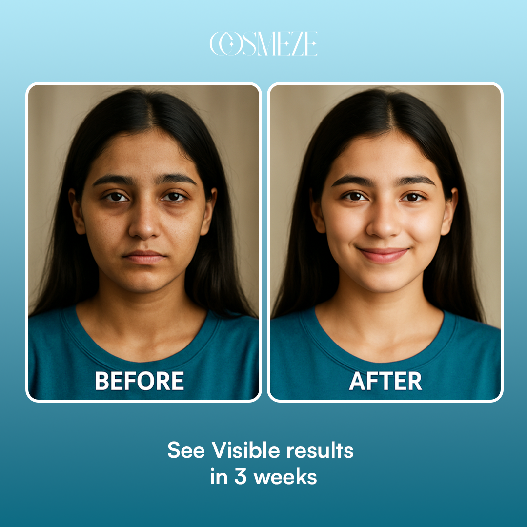 Unleash your skin’s natural radiance with the COSMEZE Skin Love Active Glow Serum, a potent blend of five scientifically backed ingredients designed to target dullness, dark spots, dryness, and uneven tone.